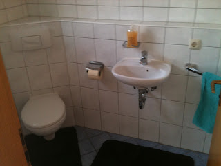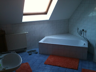 This is our upstairs bathroom, basically the one we all share and has no cabinets or closets.