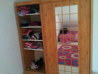 This is our "closet" Don't you just love the design on the mirror? (sarcasm)